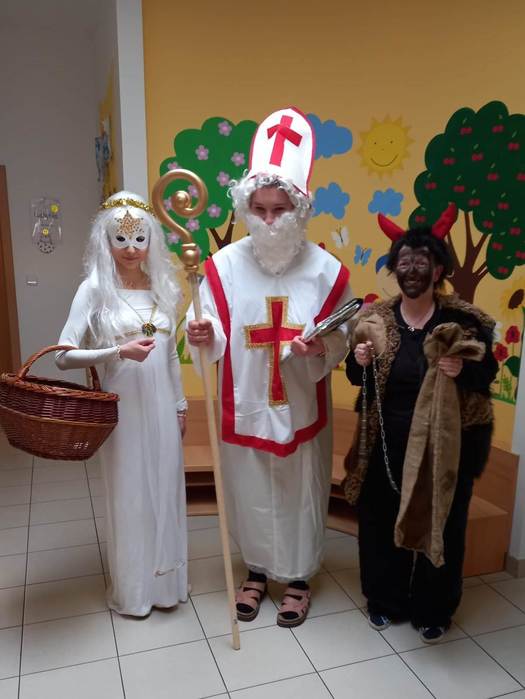 Děti z naší MŠ zažily v pátek 3.12. příjemné překvapení v podobě návštěvy pohádkových bytostí - Mikuláše, hodného čerta i anděla. Původně plánovaný Mikuláš v ZŠ se z hygienických důvodů nemohl konat, ale všechny děti si dostatečně užily Mikulášskou besídku ve svých třídách. Za básničky, tanečky a zpívání obdržely sladkou odměnu i velkou pochvalu od Mikuláše, který ve své kouzelné knize nenašel žádné připomínky. Velmi děkujeme rodičům za dobroty a žákům 6. a 7. tříd za krásné papírové andílky.