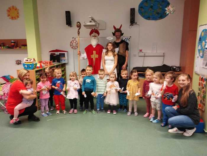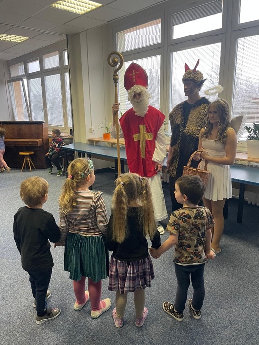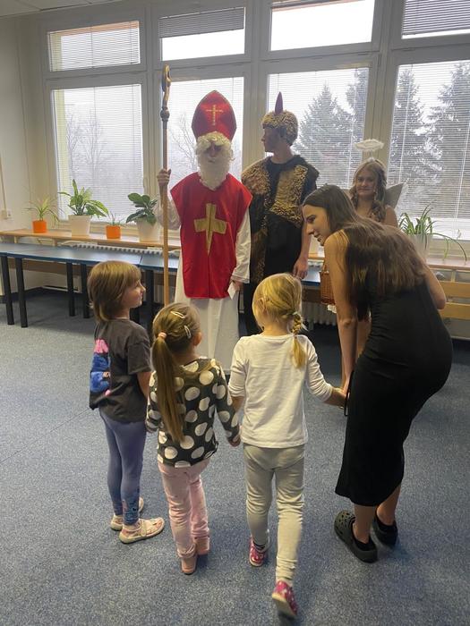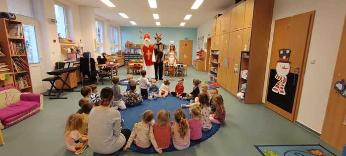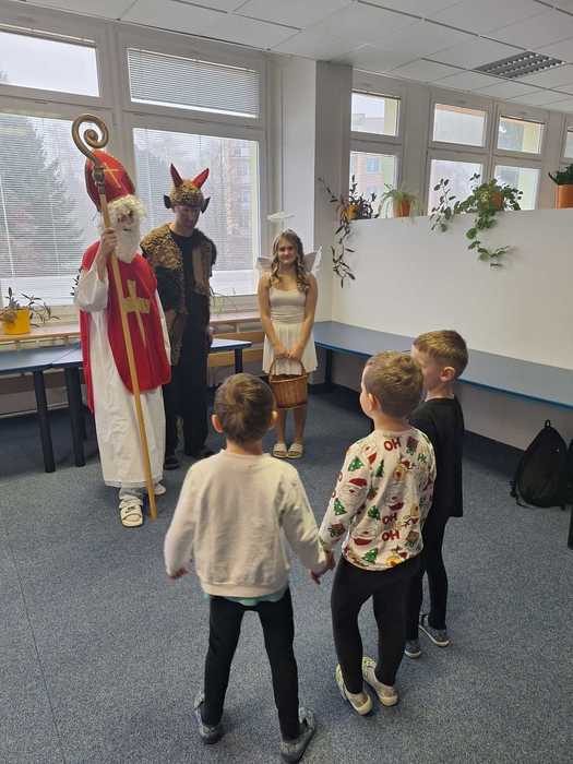 Zatímco starší děti poznávaly školu, naše nejmenší děti ze tříd Žabičky a Rybičky přišli navštívit Mikuláš, čert a anděl přímo do školky. Také ony si zazpívaly, povyprávěly a odnesly si malý balíček.