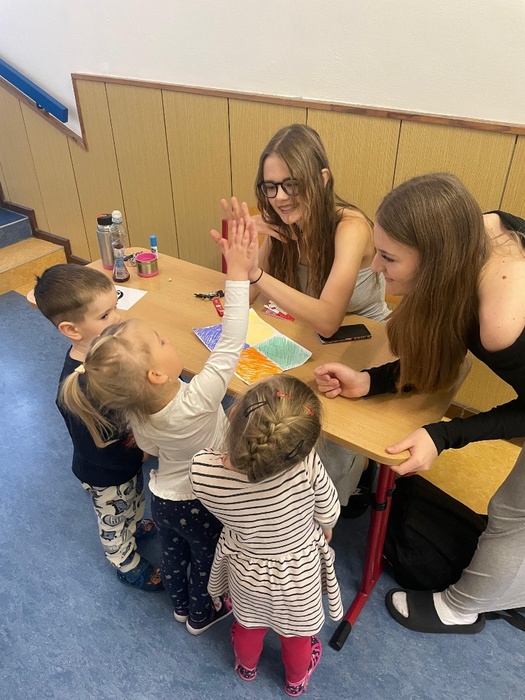 Děti společně s deváťáky prošly prostory školy a na různých stanovištích plnily připravené úkoly. Starší kamarádi ze ZŠ je trpělivě provázeli, pomáhali jim a podporovali je při plnění jednotlivých aktivit. Pro mnoho našich předškoláků to byla skvělá příležitost lépe poznat prostředí školy a postupně se s ním seznamovat.