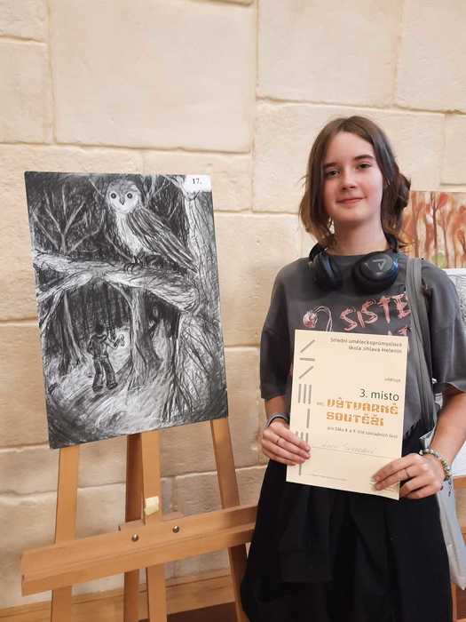 Ve středu 15. 10. 2025 se žákyně 8. a 9. tříd opakovaně zapojily do již 17. ročníku tradiční výtvarné a fotografické soutěže SPŠ v Heleníně. Letošními tématy bylo „Lesní zátiší“ a „Nejlepší přítel člověka“. Ze 170 účastníků z celého kraje zvolila porota školy 10 oceněných, mezi kterými byly hned dvě naše žákyně ze třídy 9.A – Nina Jelínková obsadila 9. místo a Lucie Svobodová krásné 3. místo. Oběma úspěšným malířkám gratulujeme a všem zúčastněným děkujeme za reprezentaci naší školy.